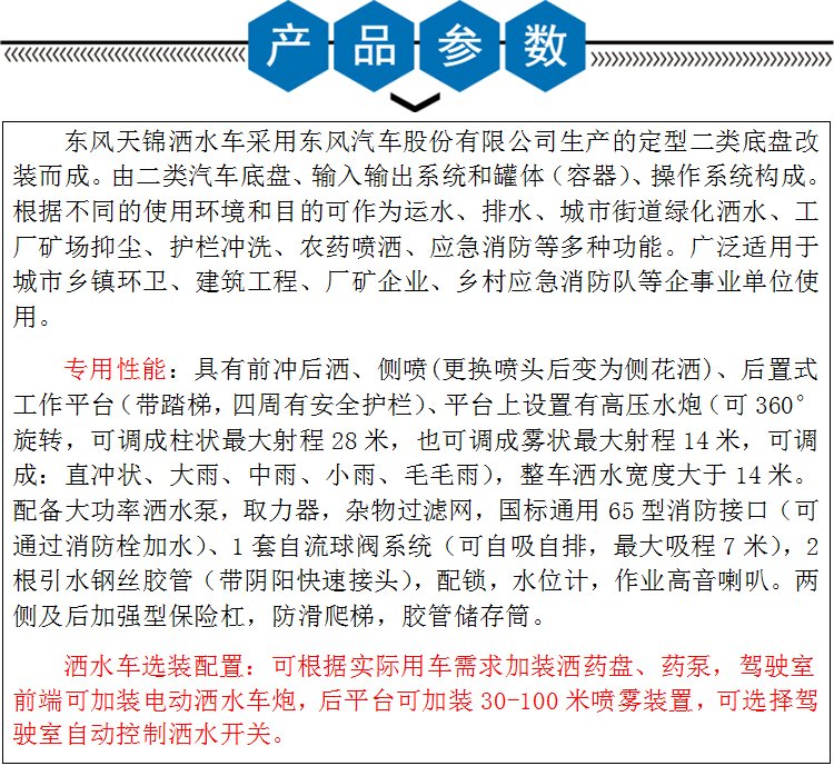 灑水車:又名公路養(yǎng)護(hù)灑水車,綠化噴灑車,是城市保潔,工程養(yǎng)護(hù),道路清洗,綠化工程的必備車型。該系列車型,配備了前沖,后灑,側(cè)噴,后自流閥,后消防栓接口和綠化炮。獨(dú)有設(shè)計(jì)的多功能綠化平臺,可活接1寸口徑的各類軟水管,是各類工程作業(yè)的必備工具車。成立以來,我們企業(yè)設(shè)計(jì)生產(chǎn)的各類灑水車產(chǎn)品,先后參與如三峽葛洲壩建設(shè),南水北調(diào),高鐵建設(shè)等大型建設(shè)項(xiàng)目,并多次輸送世界各地,支援戰(zhàn)后國家重建