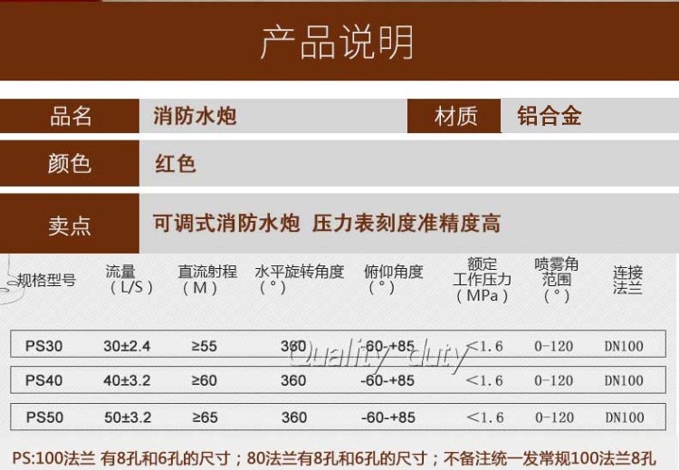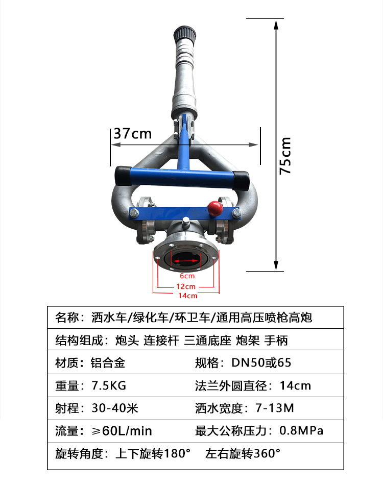灑水車灑水炮的組成 灑水車灑水炮由五部分組成:炮頭、炮桿、水炮三通、法蘭,手柄。使用方法:用戶在使用時只需要打開管路閥門,調節(jié)水炮到所需要的噴灑狀態(tài),站在灑水車的操作平臺上握住手柄,就可以輕松便捷的操作了。灑水車灑水炮適用范圍:廣泛用于東風140灑水車,東風145灑水車,東風153灑水車,東風天龍前四后八灑水車等各種灑水車。灑水炮性能:360旋轉,方向可旋轉,可調節(jié)到任意角度,可根據(jù)用戶要求上下左右自由調節(jié)。射程可達20-28m.可調節(jié)成水柱狀,大雨、中雨、毛毛雨、霧狀。