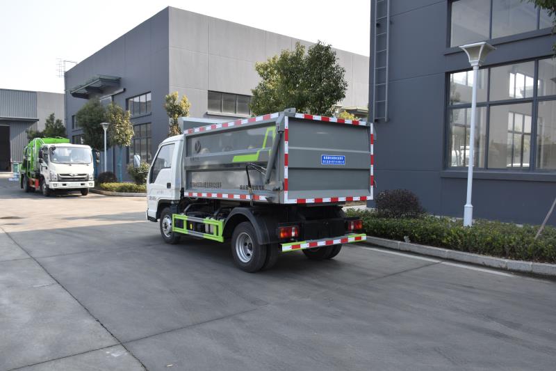 改裝容積3~4立方米,箱體采用Q235碳鋼,板材邊三底四,國(guó)內(nèi)知名油缸、多路閥,掛桶提升機(jī)構(gòu),外部操作,后蓋手動(dòng)開啟。