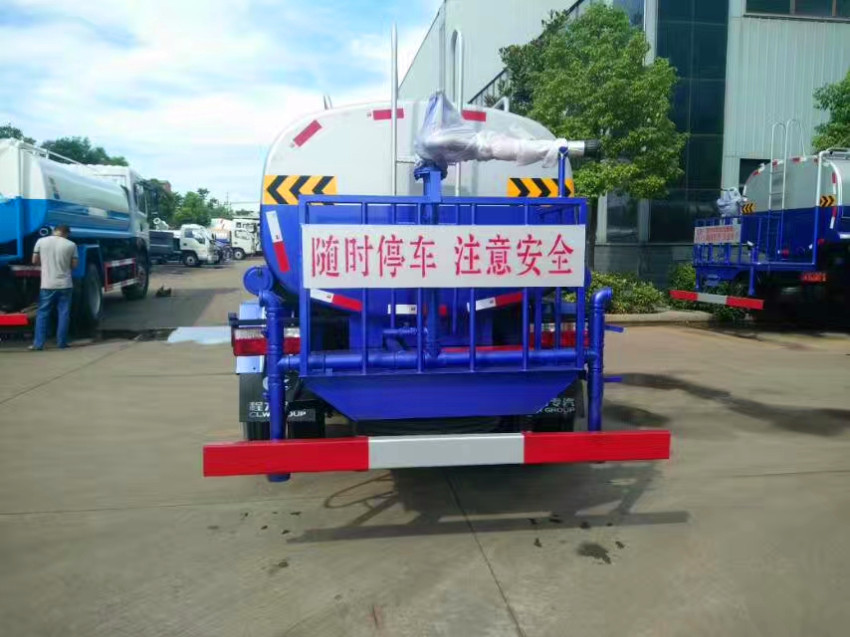 灑水車前裝有鴨形噴嘴或圓頭沖嘴,后面裝有圓柱開灑水噴嘴或蓮蓬頭噴嘴,后部有一工作平臺(tái),裝配有水炮。帶消防接頭,帶自流閥,帶自吸功能,選配20米綠化消防卷盤。
