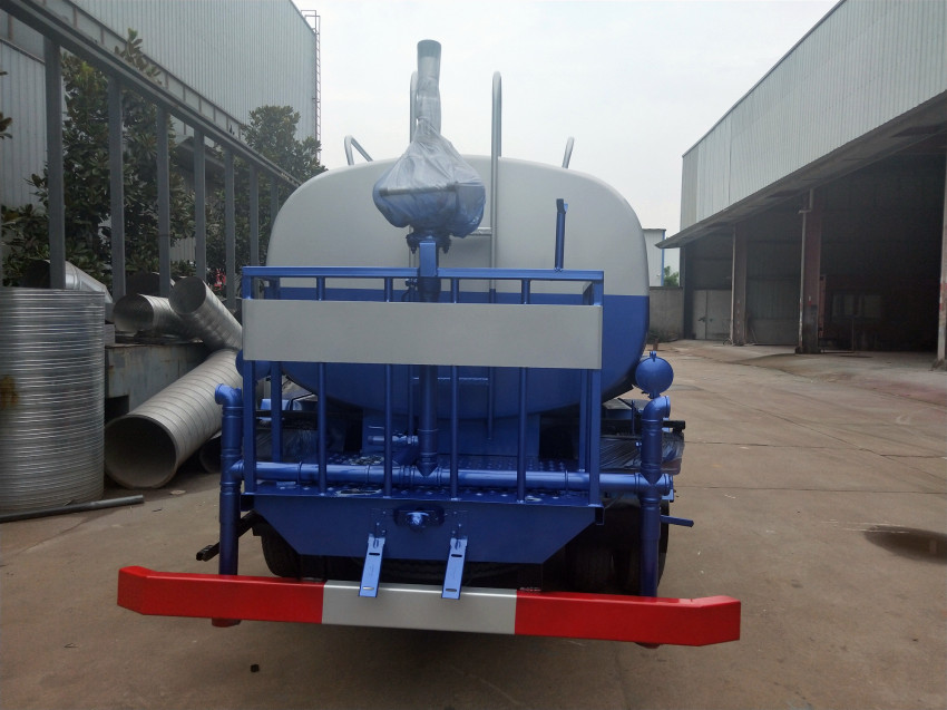 該灑水車(chē)具有前沖后灑、側(cè)噴(更換噴頭后變?yōu)閭?cè)花灑)、后置式工作平臺(tái)(帶踏梯,四周有安全護(hù)欄)、平臺(tái)上設(shè)置有高壓水炮(可360°旋轉(zhuǎn),可調(diào)成柱狀射程28米,也可調(diào)成霧狀射程14米,可調(diào)成:直沖狀、大雨、中雨、小雨、毛毛雨),整車(chē)灑水寬度大于14米.配備優(yōu)質(zhì)大功率專(zhuān)用灑水泵,取力器,雜物過(guò)濾網(wǎng),國(guó)標(biāo)通用65型消防接口(可通過(guò)消防栓加水)、1套自流球閥系統(tǒng)(可自吸自排,吸程6米),2根引水鋼絲膠管(帶陰陽(yáng)快速接頭),配鎖,水位計(jì),作業(yè)高音喇叭.兩側(cè)及后加強(qiáng)型保險(xiǎn)杠,防滑爬梯,膠管儲(chǔ)存筒.