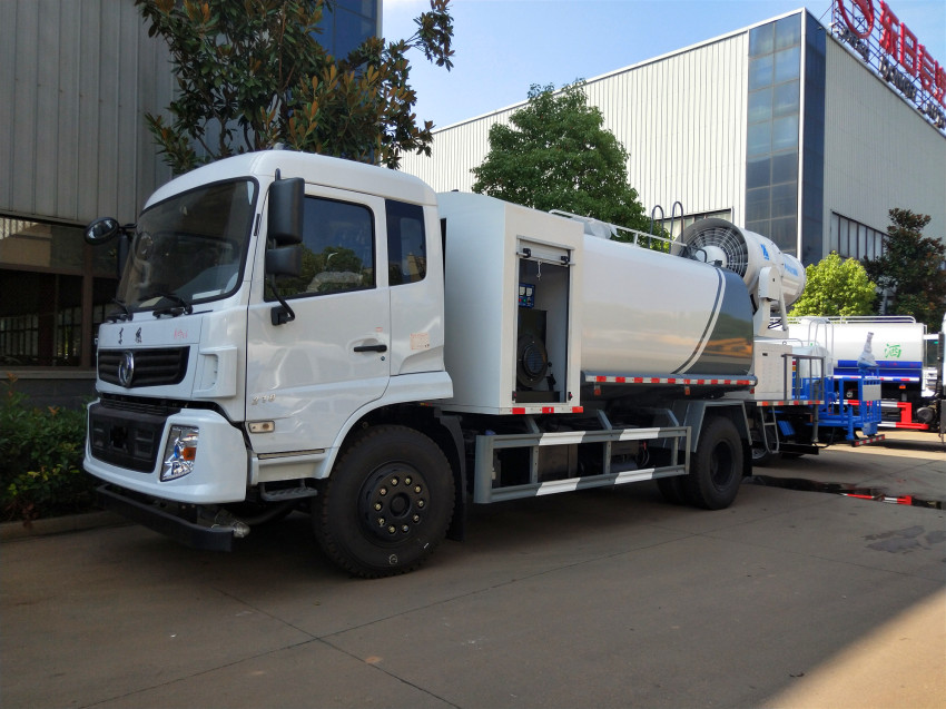 前噴后灑,前裝有鴨形噴嘴或圓頭沖嘴,后面裝有圓柱開灑水噴嘴或蓮蓬頭噴嘴,后部有一工作平臺,裝配有高壓水炮。后部還可裝8個噴嘴(選裝)噴水器一般用于沖洗街道。