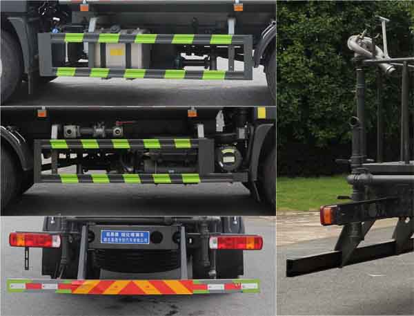 該車主要用于城鄉(xiāng)園林綠化噴灑;主要裝置為罐體及噴灑裝置;罐體總?cè)萘?11.6立方米;罐體有效容積:11.05立方米;罐體外形尺寸(長(zhǎng)×長(zhǎng)軸×短軸)(mm):4200×2450×1650,4000×2450×1730,4500×2450×1610;側(cè)、后防護(hù)材料均為:Q235碳鋼,連接方式均為:螺栓連接,后部防護(hù)截面尺寸(mm):120×50,后部防護(hù)離地高度(mm):470;ABS系統(tǒng)型號(hào):ABS-VI.E;生產(chǎn)企業(yè):廣州瑞立科密汽車電子股份有限公司.ABS系統(tǒng)型號(hào):ABS-E;生產(chǎn)企業(yè):威伯科汽車控制系統(tǒng)(中國(guó))有限公司,ABS系統(tǒng)型號(hào):3550D-1010;生產(chǎn)企業(yè):東科克諾爾商用車制動(dòng)系統(tǒng)(十堰)有限公司.選裝噴霧裝置樣式.選裝后部箭頭燈裝置,選裝后部弧形噴灑裝置,選裝水炮支架位置,選裝無(wú)高位花灑.選裝自動(dòng)球閥安裝位置,選裝前部自動(dòng)水炮樣式,前伸500mm時(shí),整車長(zhǎng)度為7950mm,8285mm.隨底盤選裝尿素罐位置,選裝電瓶位置.