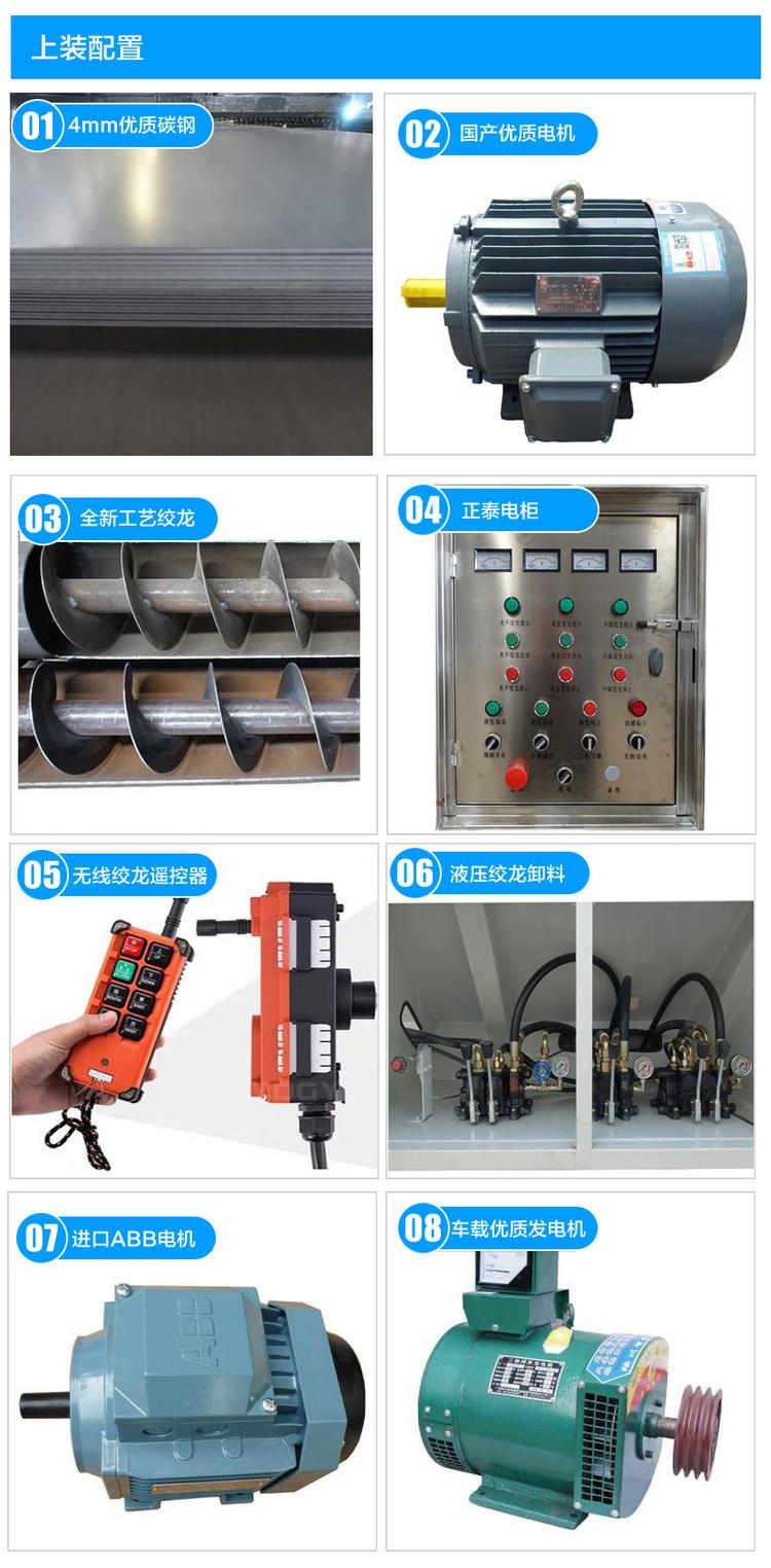 車(chē)輛參數(shù)配置:40方電動(dòng)散裝飼料運(yùn)輸車(chē),采用解放前四后六底盤(pán), 1900+4160+1350 軸距,錫柴 260/290 馬力,陜齒 9 檔變速箱,295 真空胎,電動(dòng)門(mén)窗中控鎖,電動(dòng)舉升,ABS,方向助力,上裝罐體容積約40立方,罐體采用4mm 鈦鋼板制作,罐體內(nèi)分為肆個(gè)倉(cāng),可獨(dú)立控制各分倉(cāng)卸料順序和速度,整車(chē)3條蛟龍(底部水平絞龍、尾部垂直絞龍、頂部卸料絞龍),由3個(gè)5.5kw 380v電機(jī)帶動(dòng)各絞龍工作,頂部絞龍液壓控制舉升,可左右旋轉(zhuǎn)180°,整車(chē)尺寸:11000*2550*3995,罐體尺寸:8000*2550*2500,液壓款散裝飼料運(yùn)輸車(chē),通過(guò)變速箱帶動(dòng)取力器取力后帶動(dòng)各絞龍工作,采用進(jìn)口液壓系統(tǒng),確保產(chǎn)品質(zhì)量,延長(zhǎng)使用壽命