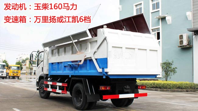 箱體容積12立方米,方形箱體,板材厚度邊四底四,后蓋液壓開啟,箱體舉升自卸,可選裝頂蓋液壓側(cè)開啟、前劃開啟。