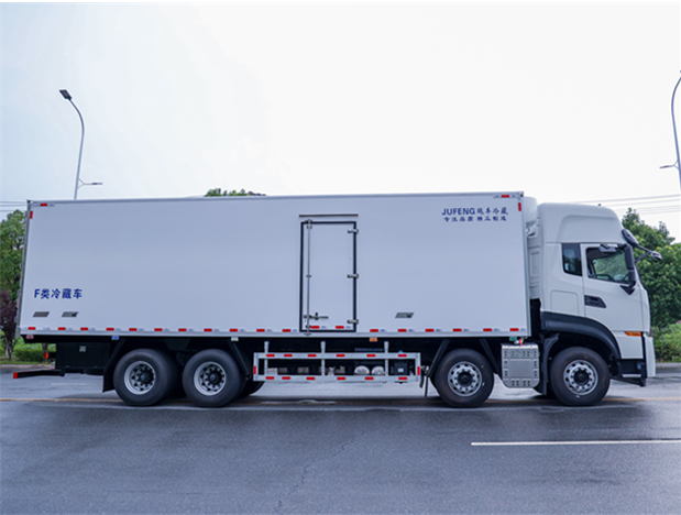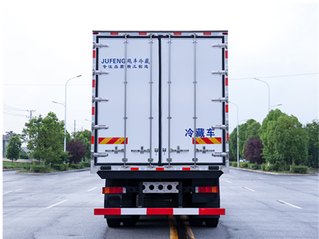 東風天龍9米6冷藏車廂體配置為:斷橋隔溫工藝,整體結構框架,內外面料為3mm新款啞光玻璃鋼夾保溫層真空復合而成,廂體厚度為8cm,最新款鋁合金包邊型材,型材局部厚度為4mm(鋼制鉚釘加固),廂體內部采用2個LED照明燈及廂體示寬燈,后門框不銹鋼材質,門框密封條為三元乙丙橡膠材質,加厚型不銹鋼合頁及鎖件;副梁為Q700車用大梁鋼,15mm厚大梁墊皮,加裝防撞膠塊,不銹鋼門鎖件,配后雙開門,副駕駛一側居中靠前開單側門一個,帶2個排水孔。