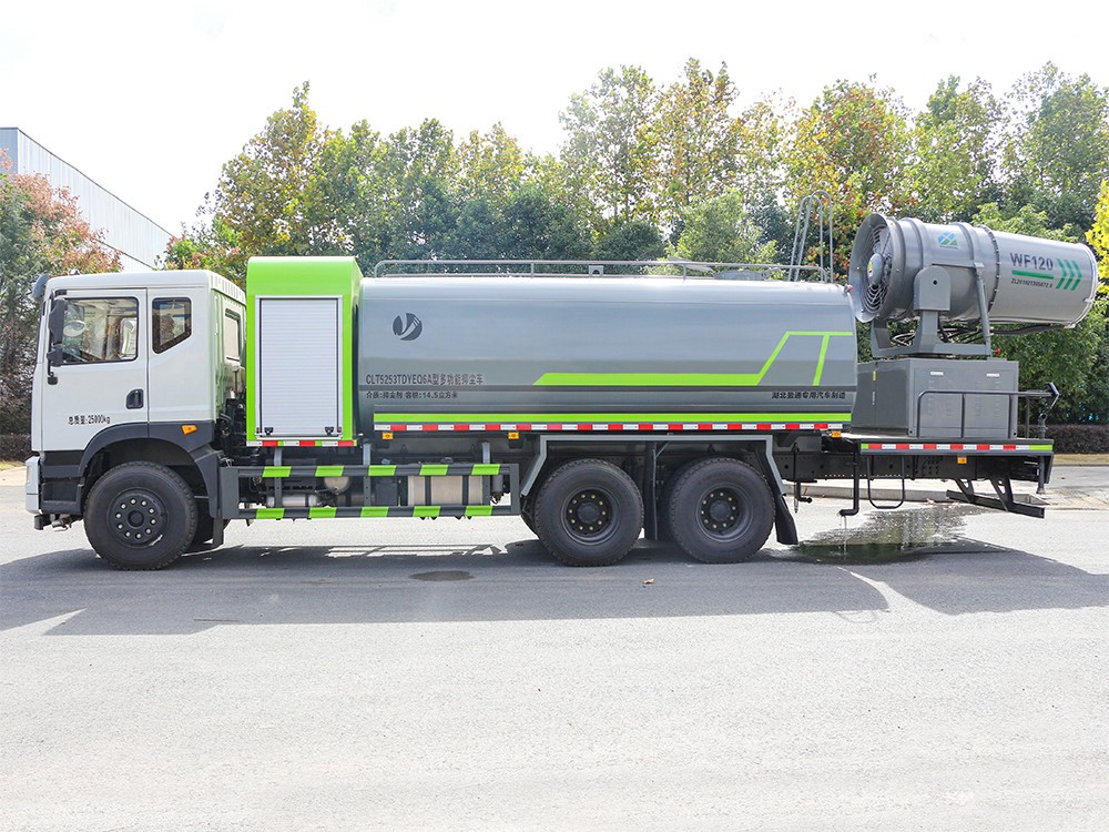 大型霧炮灑水車產(chǎn)品簡(jiǎn)述及車型圖片 1.產(chǎn)品簡(jiǎn)述:縱昂牌 CLT5253TDYEQ6A 型多功能抑塵車標(biāo)配前噴(鴨嘴)、后 對(duì)沖、后灑、側(cè)噴、后置式工作平臺(tái),平臺(tái)上配置綠化水炮(可 360°旋轉(zhuǎn),既 可以調(diào)成柱狀,也可以調(diào)成霧狀),配備優(yōu)質(zhì)大功率專用灑水泵(可自吸自排, 可從河里或池塘抽水到罐體),取力器,雜物過濾網(wǎng),消防接口,自流球閥系統(tǒng)、 取力器、球閥、濾網(wǎng)均為國(guó)家標(biāo)準(zhǔn)產(chǎn)品,主管道加粗,法蘭墊、法蘭盤加厚, 大通徑球閥。整體具備性能優(yōu)良安全可靠、效率高、流量大、維修方便等特點(diǎn)