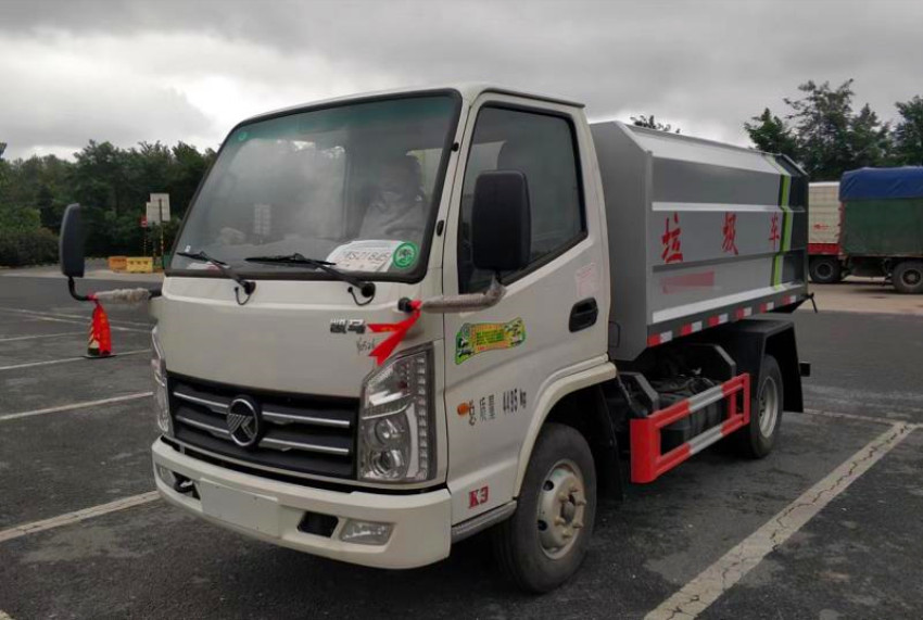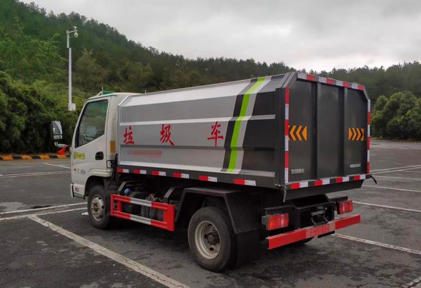 箱體容積3~4立方米,碳鋼邊三底四,國產(chǎn)油泵、多路閥、取力器、油缸,卸料方式為底部雙杠液壓舉升自卸,駕駛室外操作,鐵桶掛架,后門機械鎖緊,手動開門,可選液壓開門。