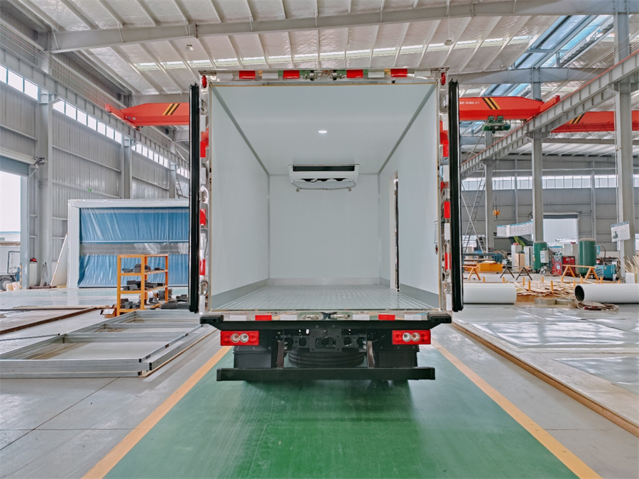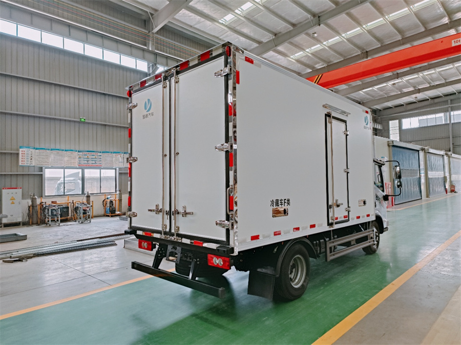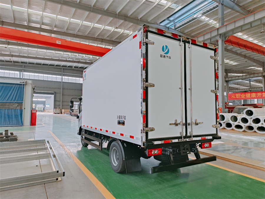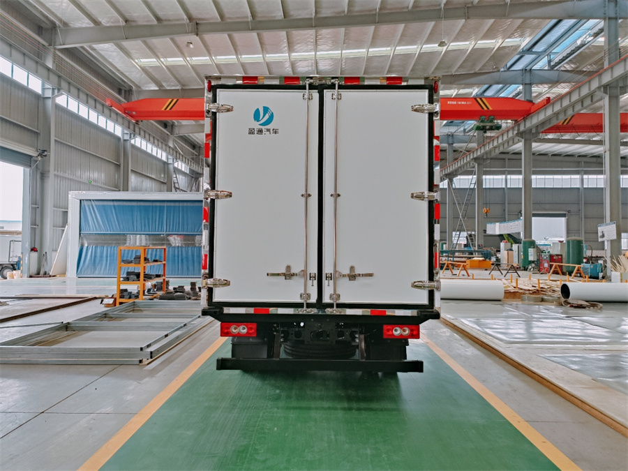 廂體采用內(nèi)外玻璃鋼材料制作,中間夾層為高密度保溫材料,用真空復(fù)合一次成型,表面光潔平整,強(qiáng)度高,使用壽命長,廂體邊緣采用優(yōu)質(zhì)鋁合金包邊和專用密封膠處理,具有重量輕、保溫、密封效果好等特點(diǎn)。門框鎖件為不銹鋼材質(zhì),門四周用一次成型密封條密封,廂體外形平整美觀,車廂頂部加以雨檐,避免下雨天雨水對(duì)車廂的浸泡,延長廂體使用壽命,車廂內(nèi)配有人性化照明系統(tǒng)。穩(wěn)固性和氣密性是普通冷藏車廂體不可比的,并且具有質(zhì)量輕,抗沖擊力強(qiáng),無滲透等優(yōu)點(diǎn)。配備國產(chǎn)580制冷機(jī)組。