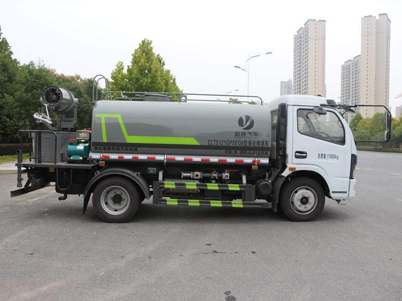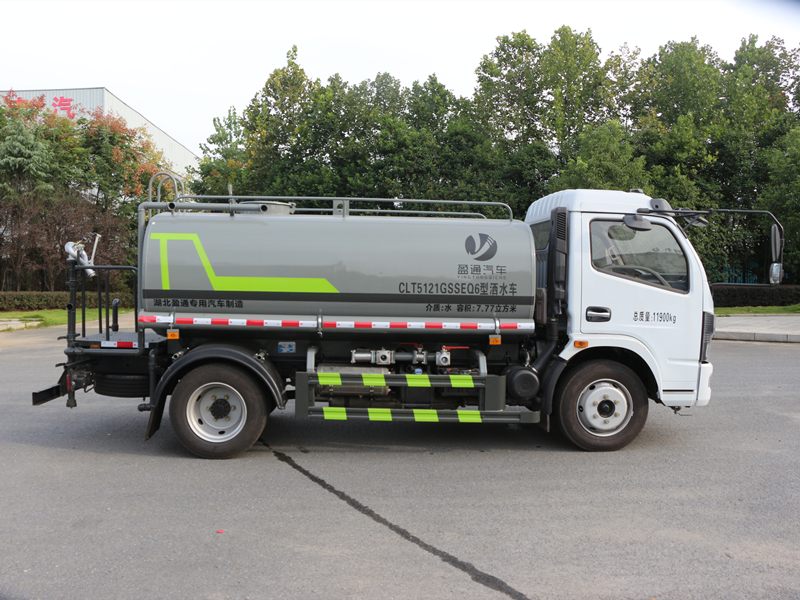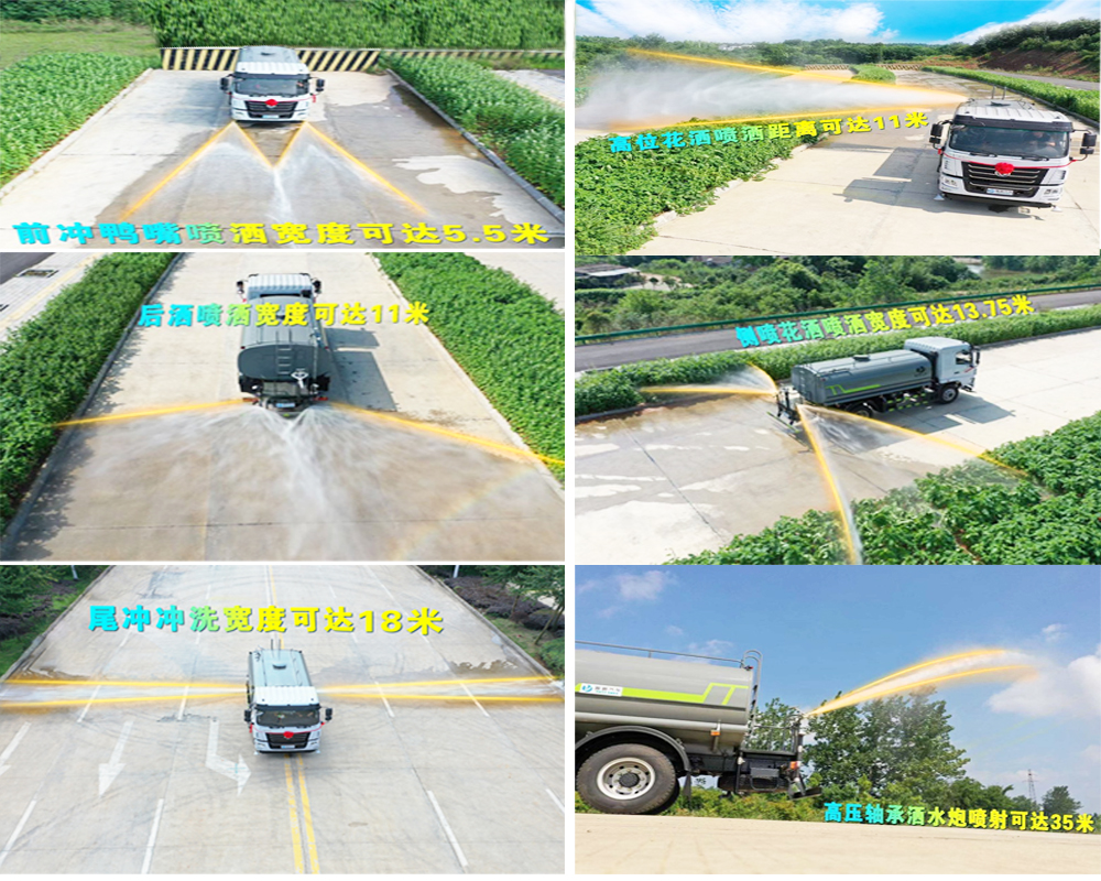 灑水車(chē)專(zhuān)用功能配置罐體實(shí)際容積約為8立方米,(罐體有效參數(shù)6.81立方米、額定載質(zhì)量6805kg、)采用武鋼優(yōu)質(zhì)碳鋼板卷壓成型。配備專(zhuān)用灑水泵,自吸自排,前噴后灑、側(cè)噴、后工作平臺(tái)及灑水高壓炮。灑水泵自吸高度為6米左右,整車(chē)灑水寬度14米左右,后工作平臺(tái)水炮可調(diào)成:直沖狀、大雨、中雨、小雨、毛毛雨,有效射程≥28米,整車(chē)帶接頭、水位計(jì),自流閥。后工作平臺(tái)主管路帶1寸澆花接口,附送2根3米水管,1個(gè)爬梯,兩側(cè)及后保險(xiǎn)杠。