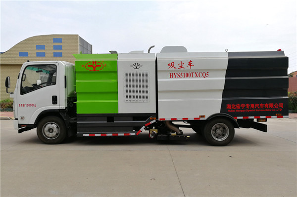 該吸塵車是采用五十鈴國五二類原廠汽車底盤改裝,加裝副發(fā)動機(jī)、風(fēng)機(jī)、清水箱、垃圾箱、中置吸盤,工作視頻探頭,自動脈沖清理功能,液壓系統(tǒng)、專用裝置電控系統(tǒng)和副車架等改裝而成。