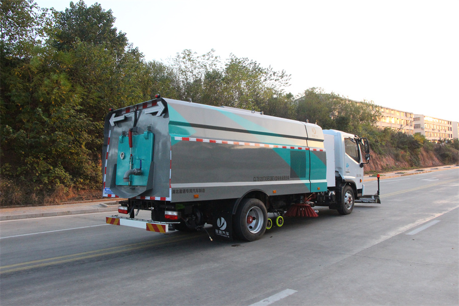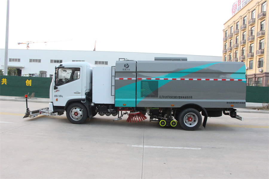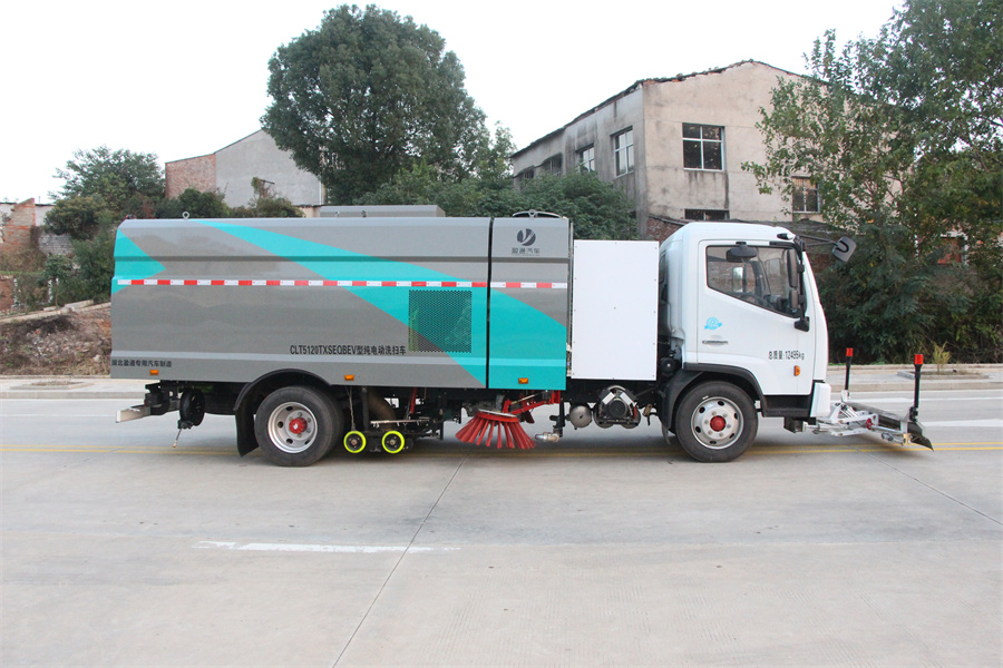 該車主要用于清掃、清洗路面垃圾污物;主要裝置為箱體及清掃裝置;側(cè)防護(hù)由專用裝置代替,后下部防護(hù)材料為:Q235碳鋼,連接方式為:螺栓連接;后下部防護(hù)截面尺寸(mm):120×50,后下部防護(hù)離地高度(mm):430;儲能種類/單體及總成生產(chǎn)企業(yè):磷酸鐵鋰蓄電池/寧德時(shí)代新能源科技股份有限公司;電機(jī)額定功率:110kW;電機(jī)峰值功率:180kW;ABS系統(tǒng)型號:ABS/ASR-24V-4S/4M,生產(chǎn)企業(yè):襄陽東風(fēng)隆誠機(jī)械有限責(zé)任公司;整車長度為8810mm時(shí),前伸為980mm;選裝前部不帶高壓清洗裝置,該狀態(tài)下車輛長度為7830mm;車輛后部箭頭燈和前部作業(yè)指示燈僅在作業(yè)時(shí)開啟;采用底盤4250mm軸距改裝.選裝左右側(cè)面樣式.