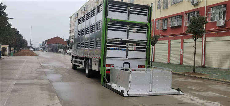 東風(fēng)天龍9.6米鋁合金拉豬車后門整體升降,裝豬時候從下往上裝第1層,依次第2層,第3層,下豬時候從上往下,鋁合金拉豬車比之前不銹鋼拉豬車自重更輕,箱體兩邊可以左右軒開,人可以站直在箱體內(nèi)清洗更方便