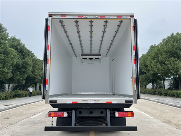奧鈴大黃蜂6米8冷藏車廂體配置為:斷橋隔溫工藝,整體結(jié)構(gòu)框架,內(nèi)外面料為3mm新款啞光玻璃鋼夾保溫層真空復(fù)合而成,廂體厚度為8cm,最新款鋁合金包邊型材,型材局部厚度為4mm(鋼制鉚釘加固),廂體內(nèi)部采用2個LED照明燈及廂體示寬燈,后門框不銹鋼材質(zhì),門框密封條為三元乙丙橡膠材質(zhì),加厚型不銹鋼合頁及鎖件;副梁為Q700車用大梁鋼,15mm厚大梁墊皮,加裝防撞膠塊,不銹鋼門鎖件,配后雙開門,副駕駛一側(cè)居中靠前開單側(cè)門一個,帶2個排水孔。