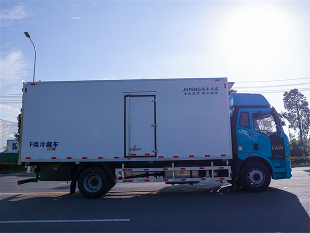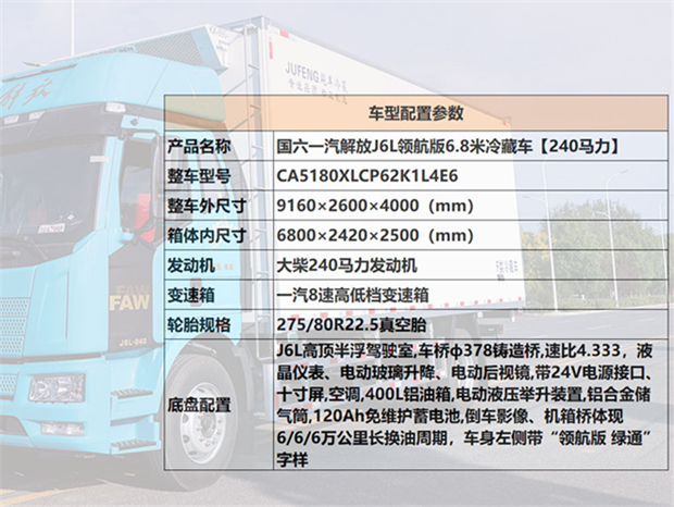 解放J6L 6米8冷藏車(chē)車(chē)身配置為:J6L精英版全浮高頂排半駕駛室,顏色為粉綠色(可選紅色,白色),液晶儀表、電動(dòng)玻璃升降、電動(dòng)后視鏡、側(cè)圍網(wǎng)兜、后圍窗簾導(dǎo)軌、全景窗簾導(dǎo)軌、頭頂放物盒、駕駛員座椅為真皮通風(fēng)空氣座椅(腰托、扶手)、中間座椅、帶24V電源接口、十寸屏、多功能大角度方向盤(pán) 自動(dòng)空調(diào)、前下防護(hù)裝置、400L鋁油箱、一體式金屬寬體保險(xiǎn)杠、駕駛室四點(diǎn)螺簧懸置、電動(dòng)液壓舉升裝置、鋁合金儲(chǔ)氣筒、120AH免維護(hù)蓄電池、LED轉(zhuǎn)向燈、霧燈帶輔助遠(yuǎn)光、懸架7/7+3、水壺座、定速巡航、VOSS管路及接頭、機(jī)箱橋體現(xiàn)6/6/6萬(wàn)公里長(zhǎng)換油周期、右轉(zhuǎn)彎音響提示、限速89km/h、T-box1.5、安全帶佩戴提醒、制動(dòng)器襯片更換報(bào)警、金色鷹標(biāo)、車(chē)身左側(cè)帶“精英版”字樣、排氣節(jié)流閥,大柴CA6DH1-24E6,240馬力發(fā)動(dòng)機(jī),(EGR+DOC+DPF+SCR氣驅(qū)),ф395離合器,變速箱CA8TAX090M變速器,車(chē)橋ф378鑄造橋(自動(dòng)調(diào)整臂、國(guó)產(chǎn)ABS、1860輪距) 9T橋,4.333,車(chē)架:237×75×6.5,275/80R22.5型18層級(jí)無(wú)內(nèi)胎(土樓輪輞、國(guó)內(nèi)一線(xiàn)品牌)。